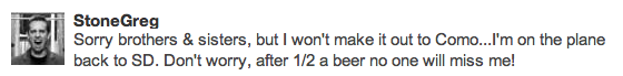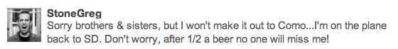 The week moved on and the day approached when the Stone reps would make their appearance in our little college town. I used the Columbia Beer Enthusiast Twitter account to promote the arrival, even going so far as to mention one of craft beer’s top-20 bachelors, Mr. Koch, as being present for the festivities. He quickly corrected me via Twitter…